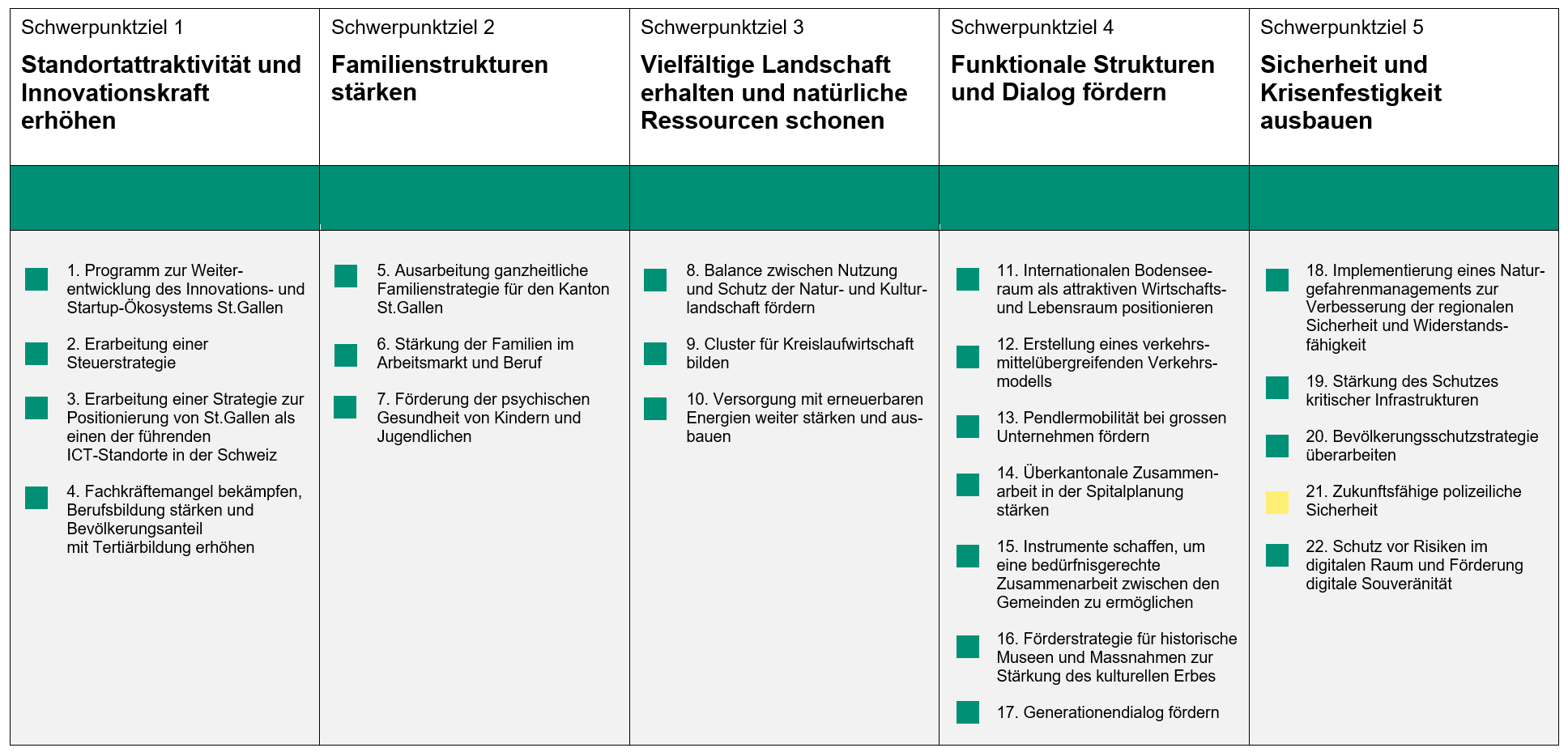 Das Umsetzungscontrolling zeigt für jede Massnahme der Schwerpunktplanung 2025–2035 den Stand der Umsetzung und eine Bewertung anhand einer Ampel. Der Umsetzungsstand der fünf Schwerpunktziele wird ebenfalls mit einer Ampel bewertet.
