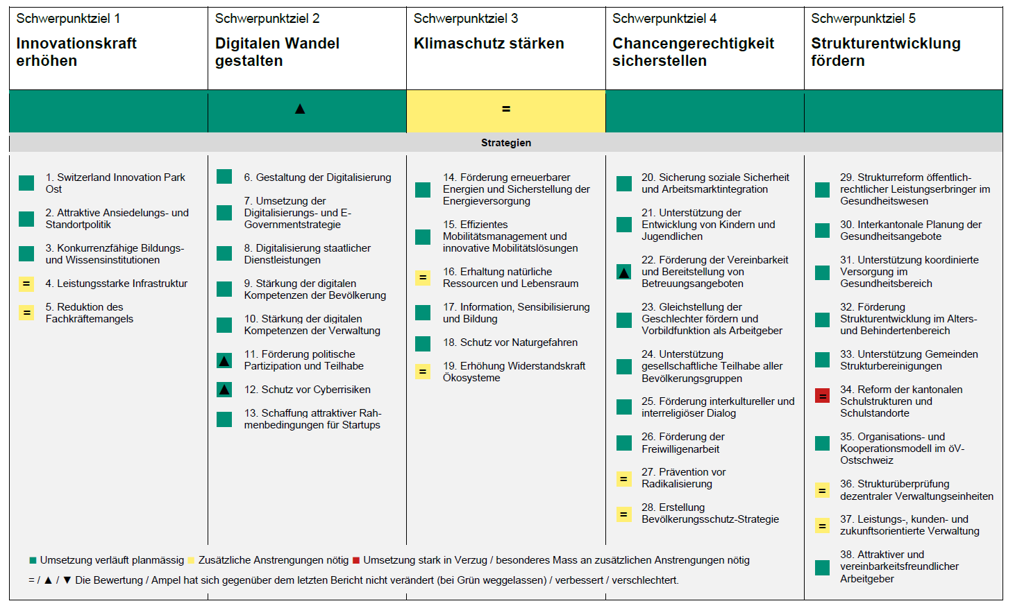 Das Umsetzungscontrolling zeigt für jede Massnahme der Schwerpunktplanung 2025–2035 den Stand der Umsetzung und eine Bewertung anhand einer Ampel. Der Umsetzungsstand der fünf Schwerpunktziele wird ebenfalls mit einer Ampel bewertet.